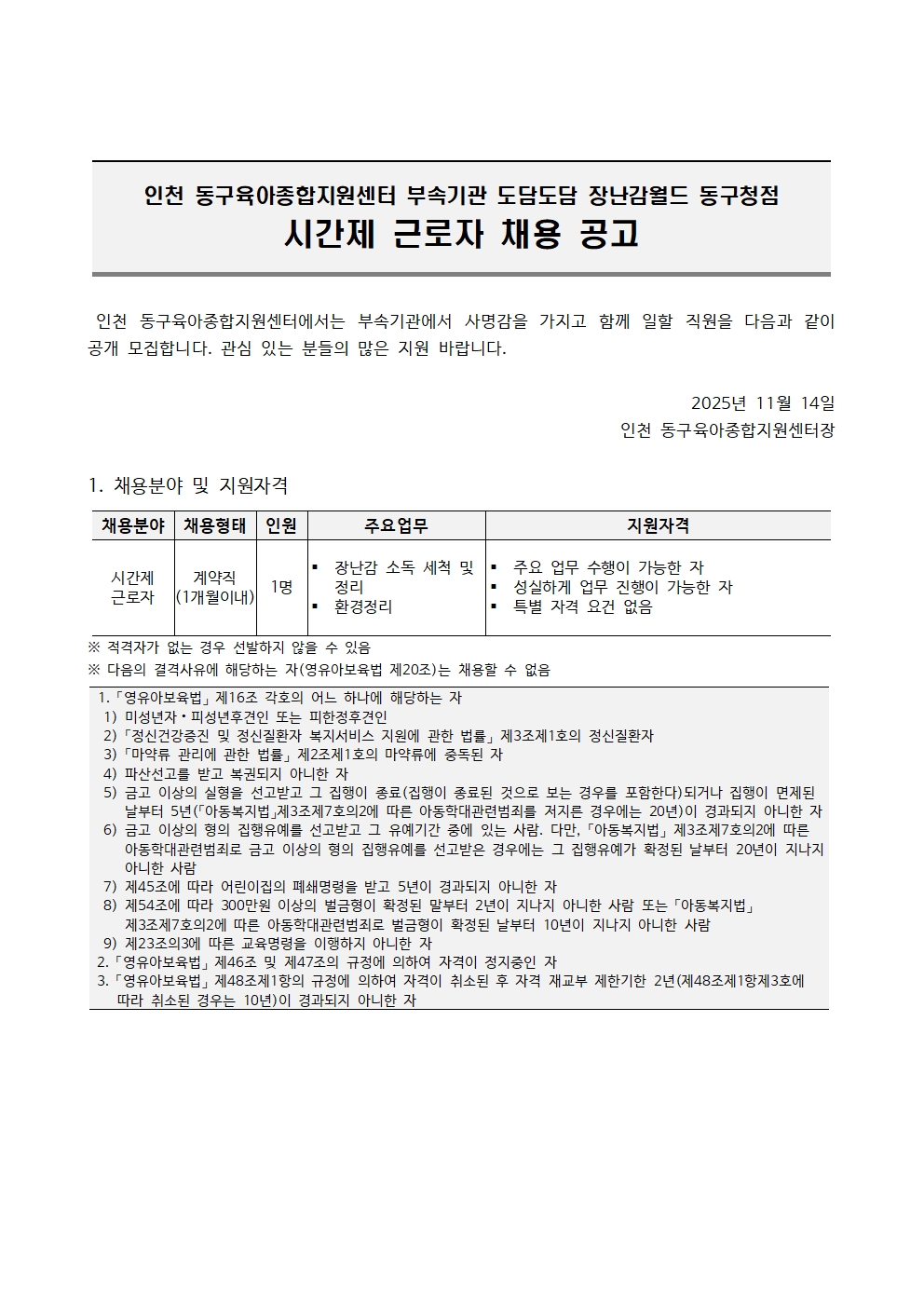 | µ¿±¸¼¾ÅÍ]µµ´ãµµ´ã Àå³°¨¿ùµå µ¿±¸Ã»Á¡ ½Ã°£Á¦ ±Ù·ÎÀÚ Ã¤¿ë °ø°í | |||||