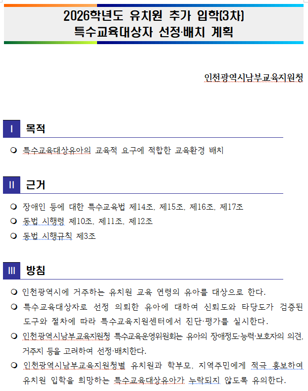 | ³²ºÎ±³À°Áöû¿ø]2026Çг⵵ À¯Ä¡¿ø Ãß°¡ ÀÔÇÐ(3Â÷) Ư¼ö±³À°´ë»ó»ç ¼±Á¤ ¹èÄ¡ °èȹ | |||||