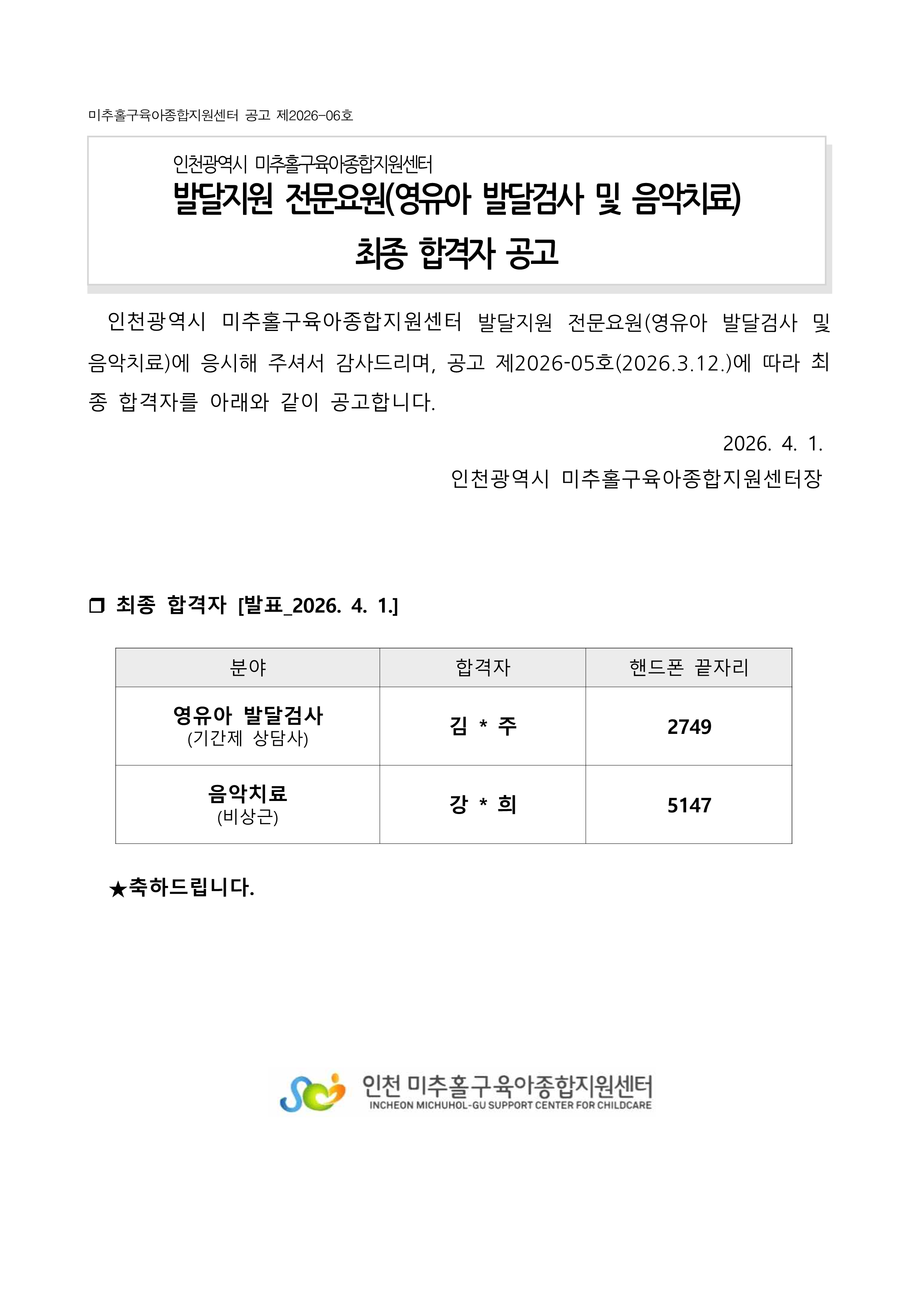 | [º»¼¾ÅÍ] ¹ß´ÞÁö¿ø Àü¹®¿ä¿ø(¿µÀ¯¾Æ ¹ß´Þ°Ë»ç ¹× À½¾ÇÄ¡·á) ÃÖÁ¾ ÇÕ°ÝÀÚ ¹ßÇ¥ | |||||