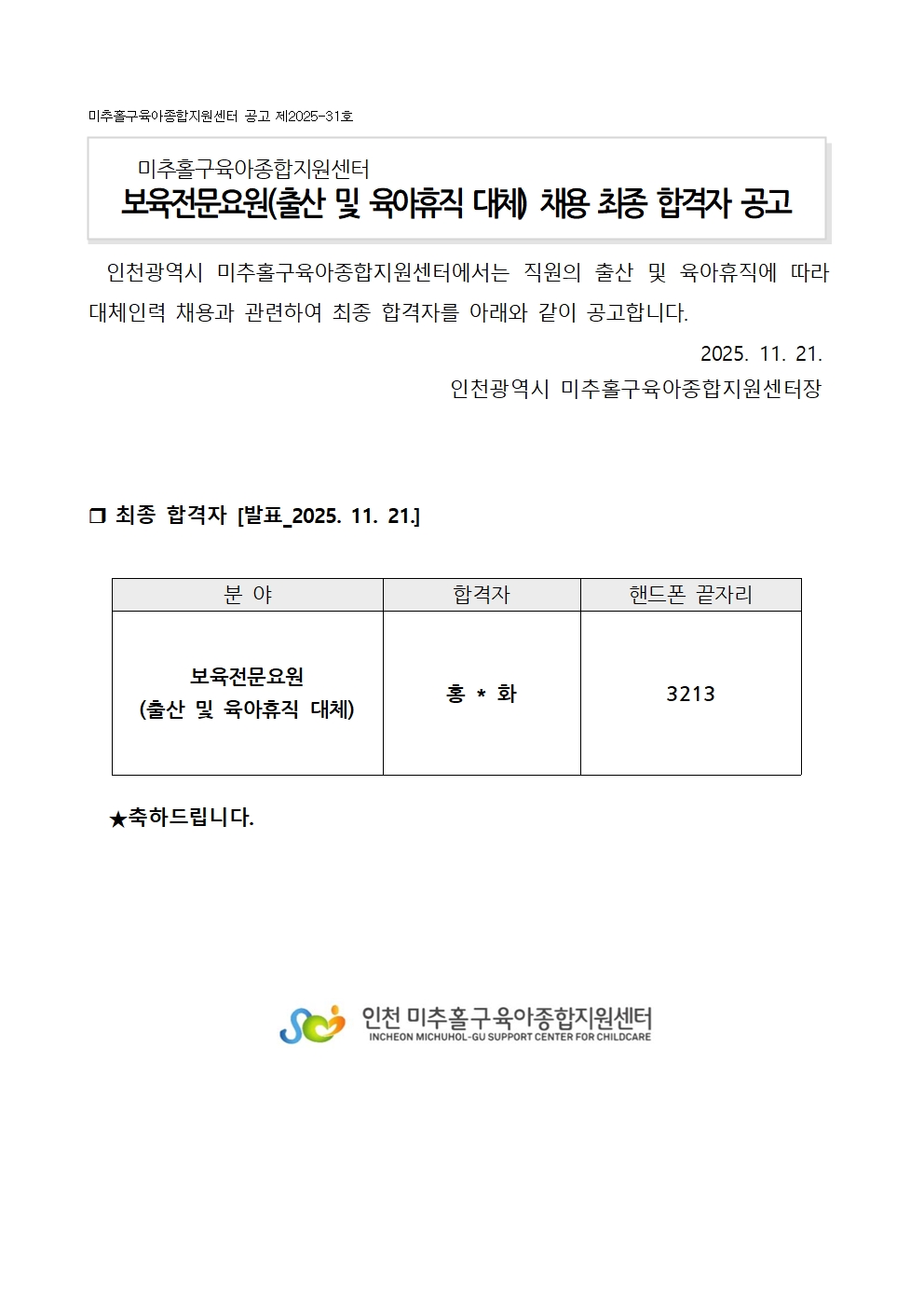 | [º»¼¾ÅÍ] Á÷¿øÃ¤¿ë(º¸À°Àü¹®¿ä¿ø: Ãâ»ê ¹× À°¾ÆÈÞÁ÷ ´ëü) ÃÖÁ¾ ÇÕ°ÝÀÚ °ø°í | |||||