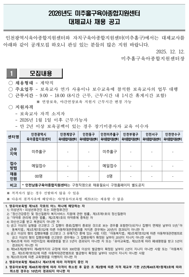 ºÙÀÓ1) ¡¸2026³âµµ ´ëü±³»ç Áö¿ø»ç¾÷¡¹ ¹ÌÃßȦ±¸À°¾ÆÁ¾ÇÕÁö¿ø¼¾ÅÍ ÀηÂä¿ë °ø°í¹®.pdf ºÙÀÓ5) ÀÎõ¹ÌÃßȦ±¸À°¾ÆÁ¾ÇÕÁö¿ø¼¾ÅÍ ´ëü±³»ç Áö¿ø¼ ¹× °³ÀÎÁ¤º¸µ¿ÀǼ.hwp |