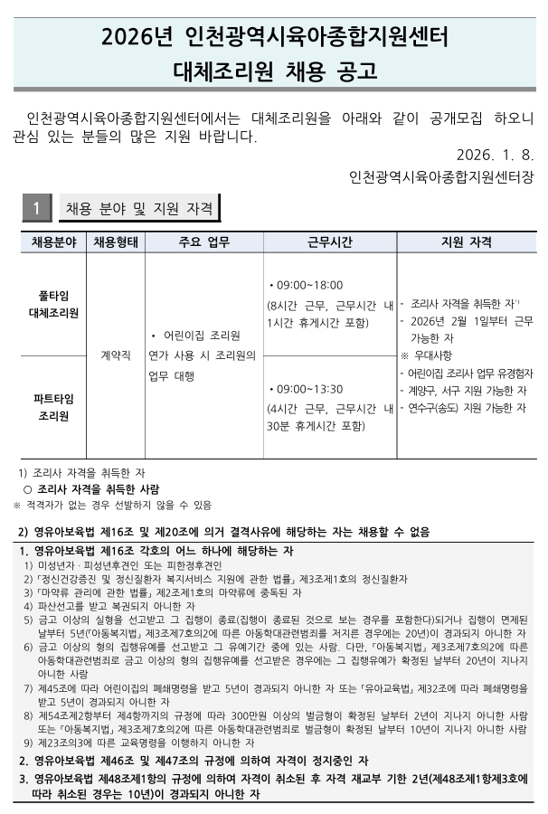 ºÙÀÓ1)2026³â ÀÎõ±¤¿ª½ÃÀ°¾ÆÁ¾ÇÕÁö¿ø¼¾ÅÍ ´ëüÁ¶¸®¿ø ä¿ë °ø°í.pdf ºÙÀÓ2)2026³â ´ëüÁ¶¸®¿ø Áö¿ø¼ ¾ç½Ä.hwp |