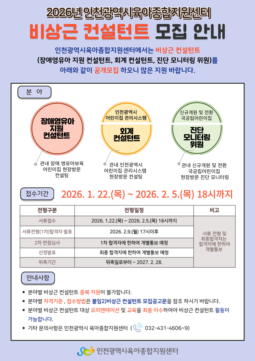 ºÙÀÓ2. 2026³â ÀÎõ±¤¿ª½Ã À°¾ÆÁ¾ÇÕÁö¿ø¼¾ÅÍ ºñ»ó±ÙÄÁ¼³ÅÏÆ® ¸ðÁý °ø°í.pdf ºÙÀÓ3-1. 2026³â Àå¾Ö¿µÀ¯¾ÆÁö¿ø ÄÁ¼³ÅÏÆ® Áö¿ø¼.hwp ºÙÀÓ3-2. 2026³â ȸ°è ÄÁ¼³ÅÏÆ® Áö¿ø¼.hwp |