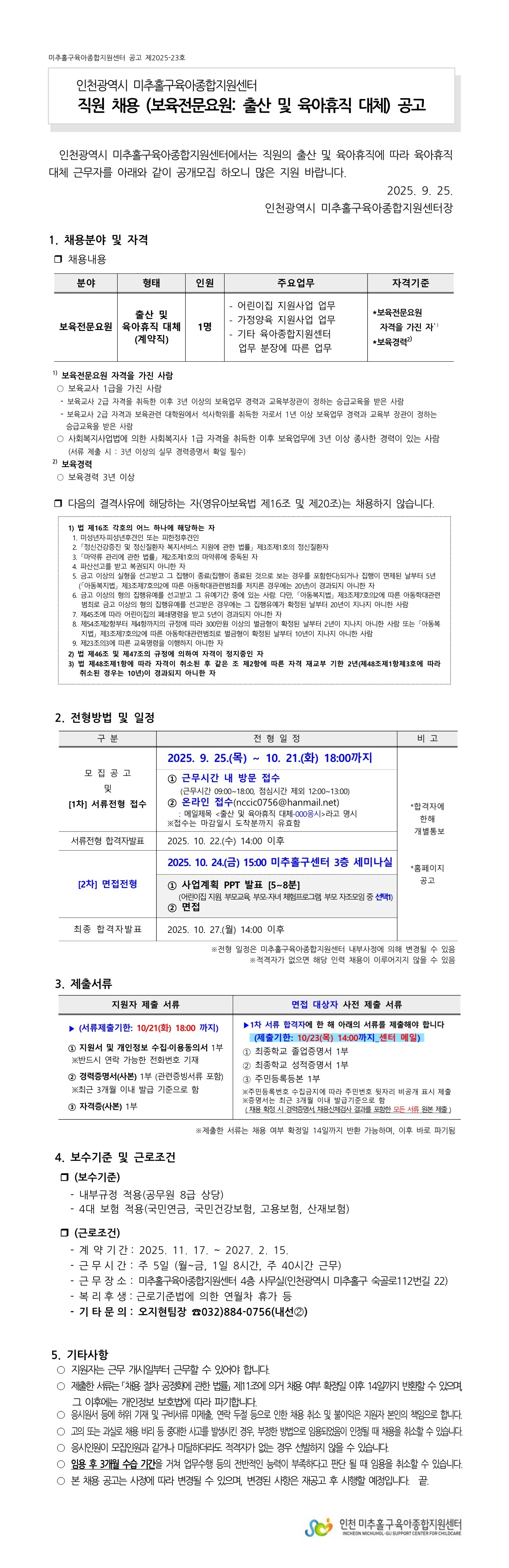 ºÙÀÓ1_°ø°í23È£-¹ÌÃßȦ±¸À°¾ÆÁ¾ÇÕÁö¿ø¼¾ÅÍ º¸À°Àü¹®¿ä¿ø_À°¾ÆÈÞÁ÷ ´ëü ä¿ë °ø°í.pdf ºÙÀÓ2_°ø°í24È£-¹ÌÃßȦ±¸À°¾ÆÁ¾ÇÕÁö¿ø¼¾ÅÍ Áö¿ø¼ ¹× °³ÀÎÁ¤º¸¼öÁýÀÌ¿ë µ¿ÀǼ.hwp |
