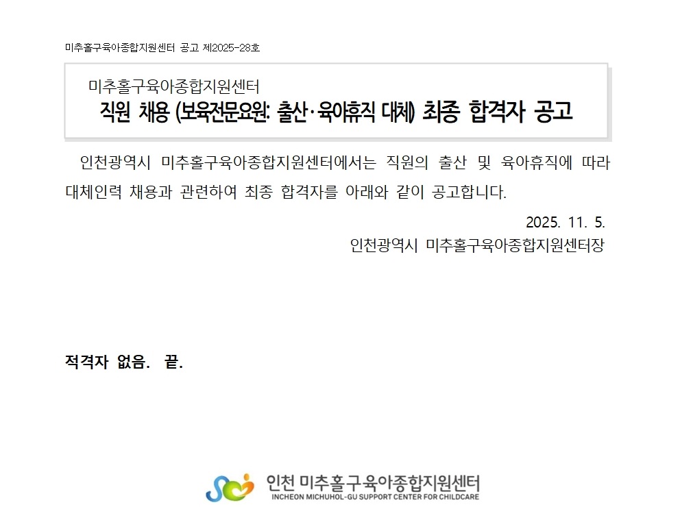 | [º»¼¾ÅÍ_ä¿ë] Á÷¿øÃ¤¿ë(º¸À°Àü¹®¿ä¿ø: Ãâ»ê ¹× À°¾ÆÈÞÁ÷ ´ëü) ÃÖÁ¾ ÇÕ°ÝÀÚ °ø°í | |||||