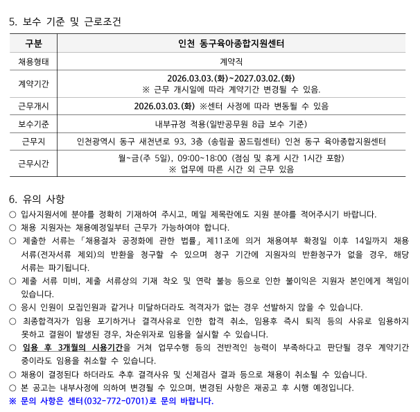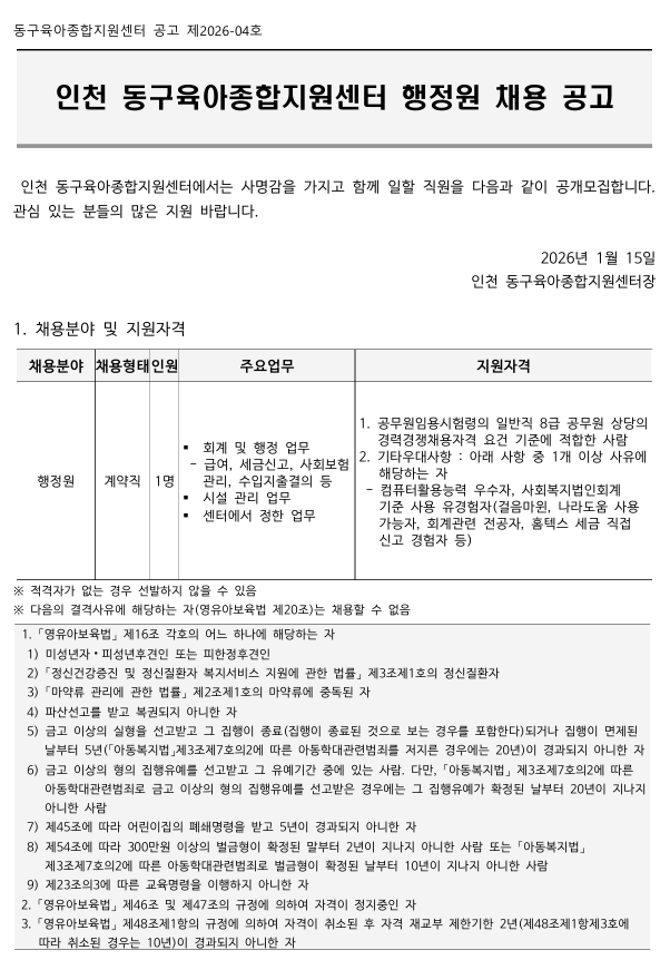 26-002 ºÙÀÓ1. ÀÎõ µ¿±¸À°¾ÆÁ¾ÇÕÁö¿ø¼¾ÅÍ Á÷¿ø ä¿ë(¿î¿µ¿ä¿ø) °ø°í¹® 1ºÎ..pdf 26-002 ºÙÀÓ2. Á÷¿ø ä¿ë ¼½Ä(¿î¿µ¿ä¿ø)1ºÎ.hwpx |