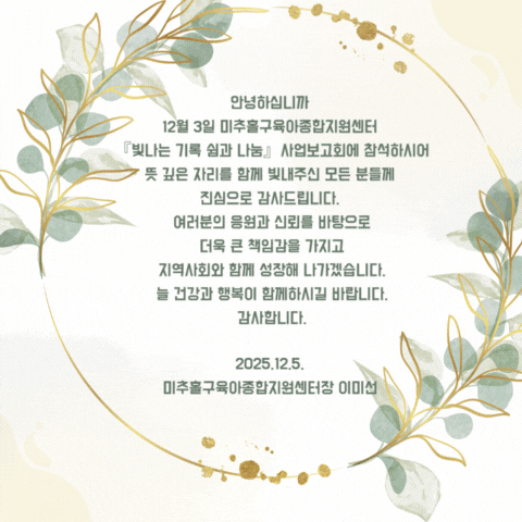 | ¡Ú[º»¼¾ÅÍ] 'ºû³ª´Â ±â·Ï, ½°°ú ³ª´®' 2025³â ¹ÌÃßȦ±¸À°¾ÆÁ¾ÇÕÁö¿ø¼¾ÅÍ »ç¾÷º¸°íȸ °¨»ç Àλç | |||||