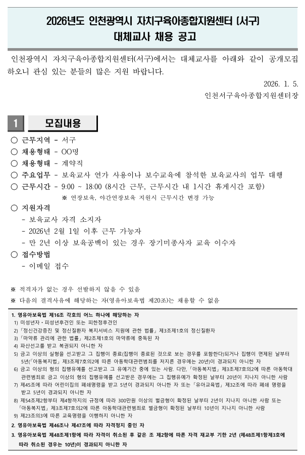 ºÙÀÓ1) 2026³â 3Â÷ ´ëü±³»ç ä¿ë °ø°í.pdf ºÙÀÓ2) ÀÎõ¼±¸À°¾ÆÁ¾ÇÕÁö¿ø¼¾ÅÍ ´ëü±³»ç Áö¿ø¼ ¹× µ¿ÀǼ.hwp |