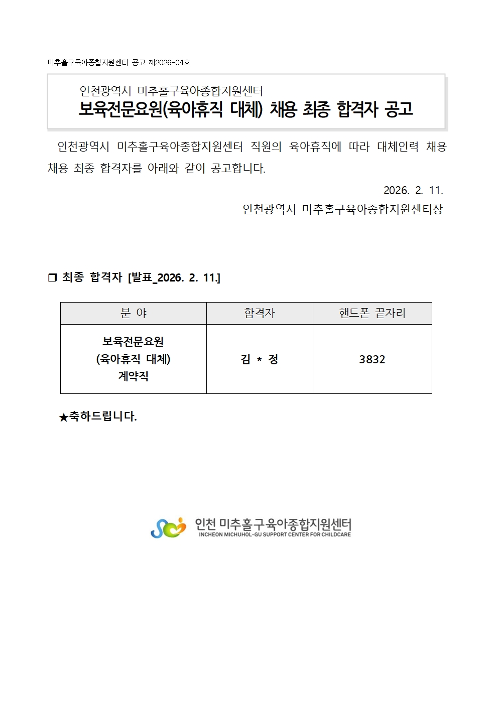 [º»¼¾ÅÍ_ä¿ë] º¸À°Àü¹®¿ä¿ø(À°¾ÆÈÞÁ÷ ´ëü) ä¿ë ÃÖÁ¾ ÇÕ°ÝÀÚ °ø°í