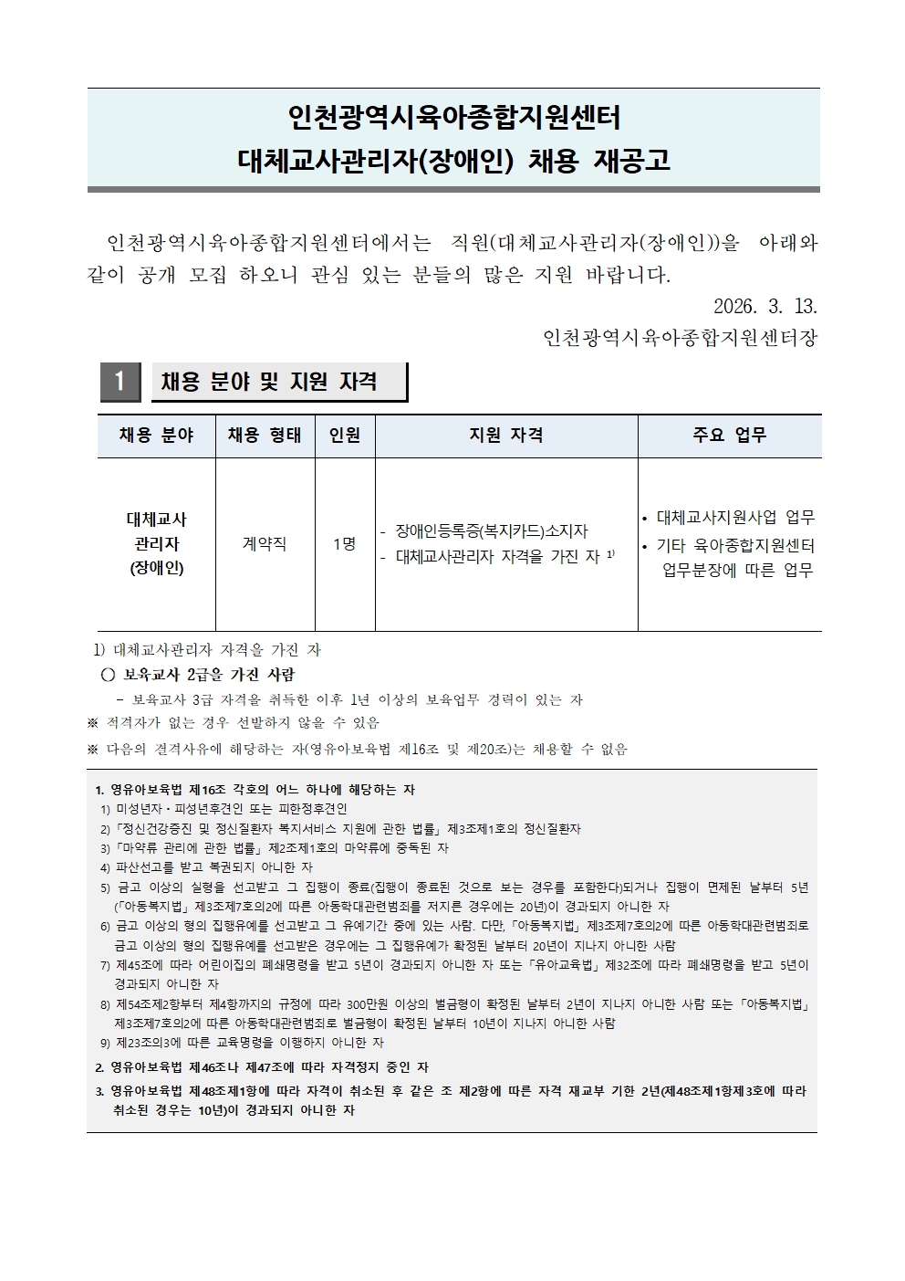 | ÀÎõ½Ã¼¾ÅÍ]´ëü±³»ç°ü¸®ÀÚ(Àå¾ÖÀÎ)ä¿ë Àç°ø°í | |||||