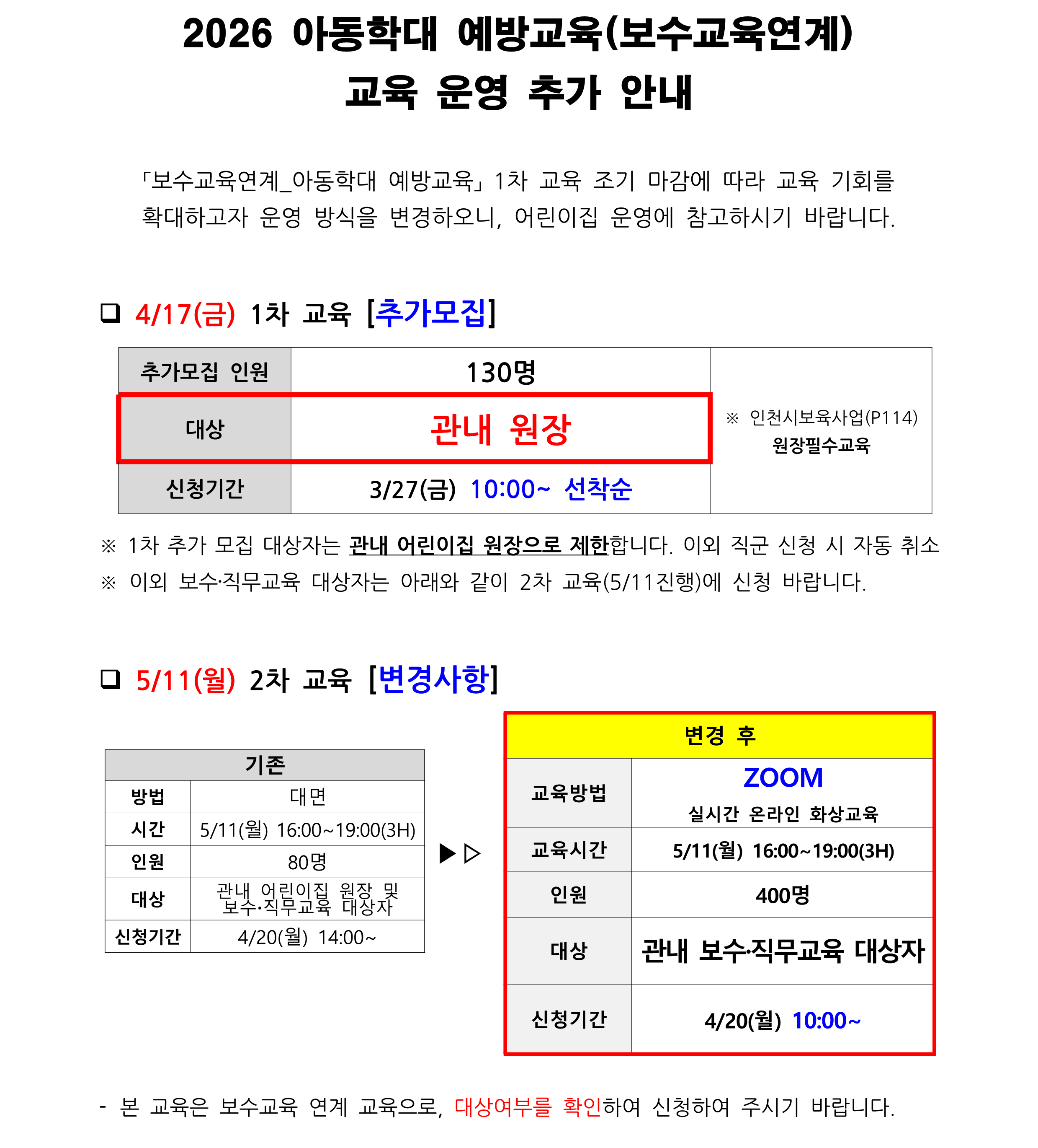 | [º»¼¾ÅÍ] 2026 º¸À°±³Á÷¿ø ¾Æµ¿ÇÐ´ë ¿¹¹æ±³À°(º¸¼ö±³À°¿¬°è) ±³À° ¿î¿µ º¯°æ ¾È³» | |||||