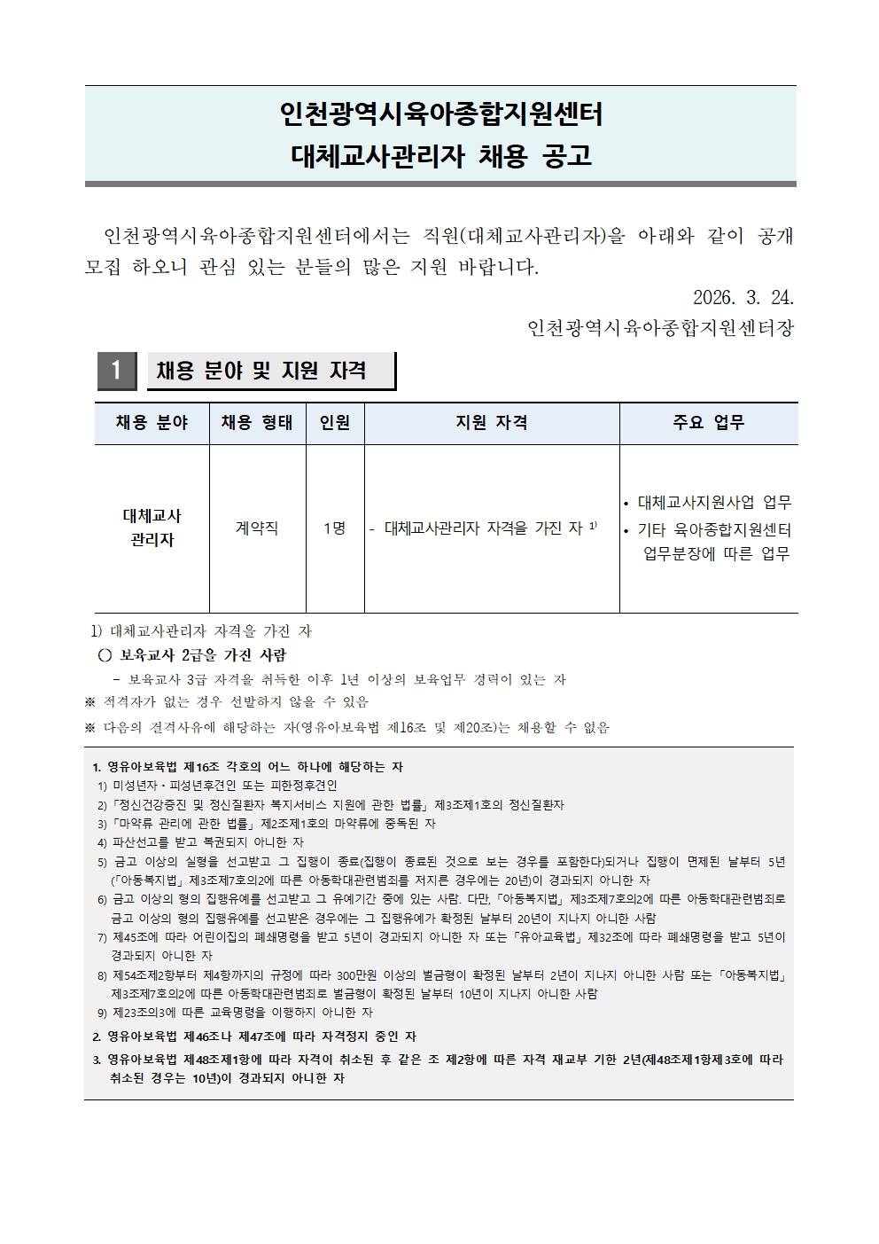 ºÙÀÓ1)2026³â ÀÎõ±¤¿ª½ÃÀ°¾ÆÁ¾ÇÕÁö¿ø¼¾ÅÍ ´ëü±³»ç°ü¸®ÀÚ Ã¤¿ë°ø°í.pdf ºÙÀÓ2)´ëü±³»ç°ü¸®ÀÚ Ã¤¿ë Áö¿ø¼ ¾ç½Ä.hwp |