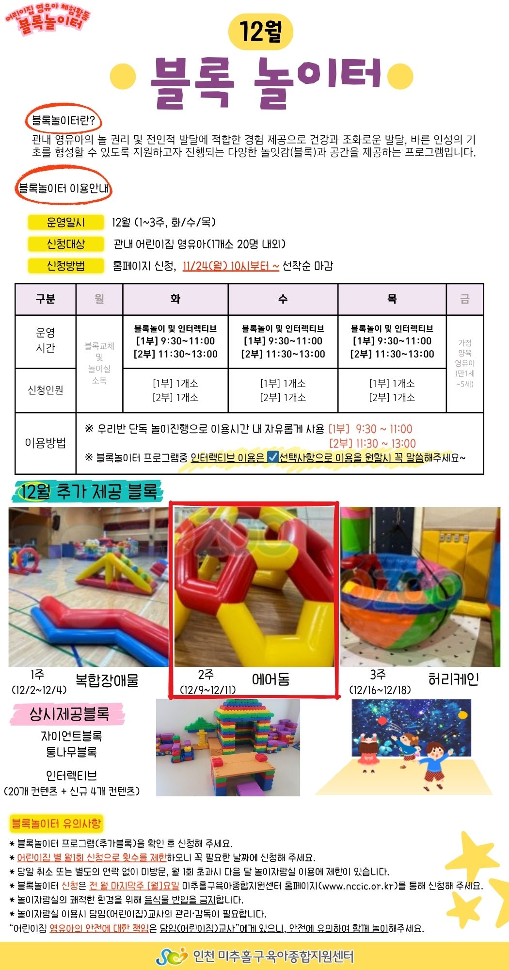 ±³À°½Åû½Ã À¯ÀÇ»çÇסÚ[1ºÎ 9:30~11:00], [2ºÎ 11:30~13:00] ½Ã°£ ²À È®ÀÎ ÈÄ ½ÅÃ»ÇØÁÖ¼¼¿ä. ¡Ú1°³¼Ò ¾î¸°ÀÌÁý ´Üµ¶»ç¿ëÇÕ´Ï´Ù. ¡Ú¹Ýµå½Ã Âü¼®ÀÚ(À̸§,ÀüȹøÈ£) ¾î¸°ÀÌÁý ¸í Á¤È®ÇÏ°Ô ±âÀÔÇØÁÖ¼¼¿ä. ¡Ú»ç¿ëÈÄ ¹Ýµå½Ã Á¤¸®Á¤µ· ÇØÁÖ¼¼¿ä. ¡ÚüÇè³îÀÌ½Ç ÀÌ¿ë½Ã "¿µÀ¯¾ÆÀÇ ¾ÈÀüÀº ´ãÀÓ±³»çÀÇ Áöµµ"°¡ ÇÊ¿äÇØ¿ä. ¡Ø¾î¸°ÀÌÁý º° ½Åû ¿ù1ȸ [Ƚ¼öÁ¦ÇÑ] ¡Ú¹®ÀÇ)¹ÌÃßȦ±¸À°¾ÆÁ¾ÇÕÁö¿ø¼¾ÅÍ ¢Ï032)884-0756 |