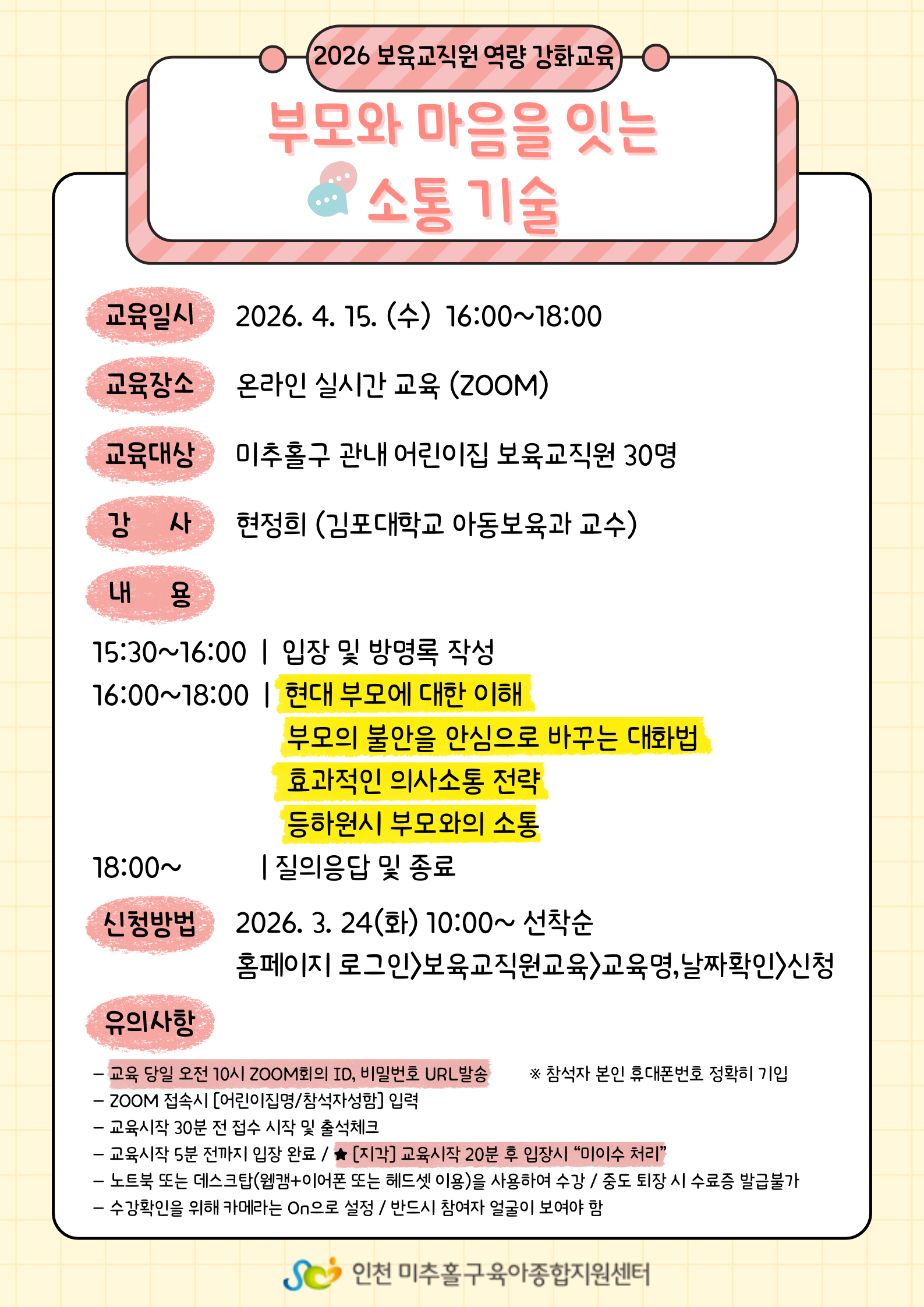 | ±³À°ÀÏ | 2026-04-15(¼ö) | ±³À°½Ã°£ | 16½Ã00ºÐ ~ 18½Ã00ºÐ |