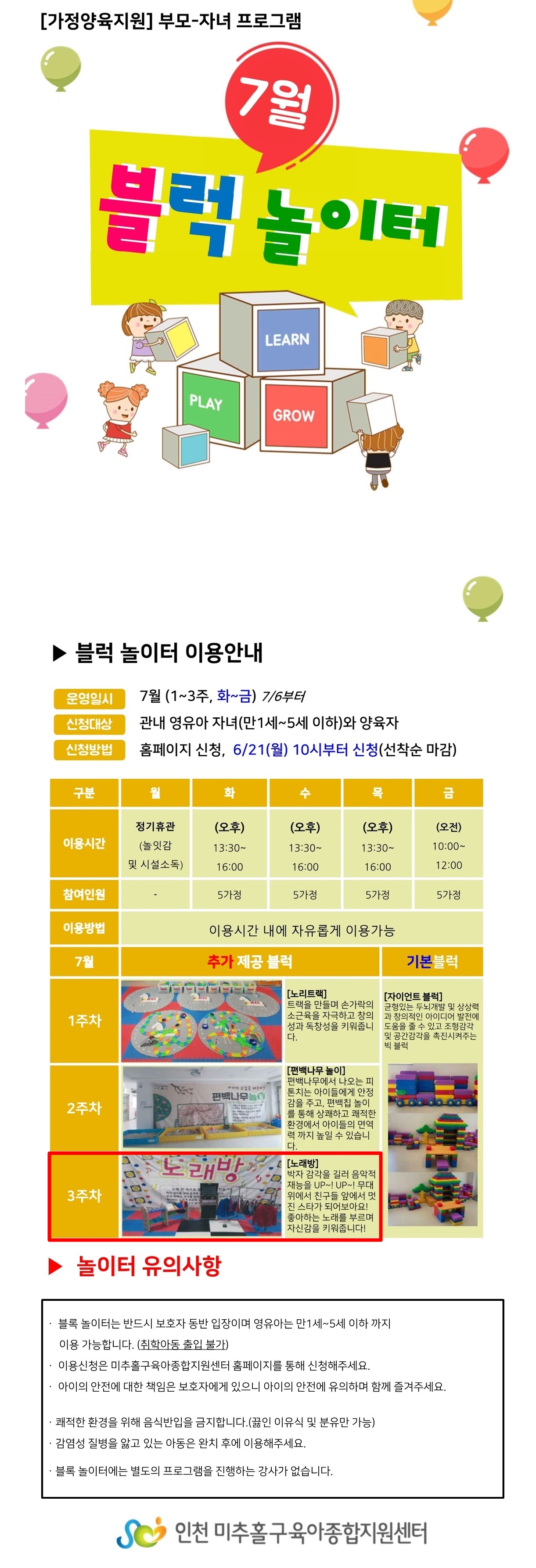| ±³À°Àå¼Ò | ¹ÌÃßȦ±¸À°¾ÆÁ¾ÇÕÁö¿ø¼¾ÅÍ 3Ãþ ³îÀÌÀÚ¶÷½Ç | ±³À°´ë»ó | °ü³» ¿µÀ¯¾Æ(¸¸1¼¼~5¼¼ ÀÌÇÏ)¿Í º¸È£ÀÚ |
